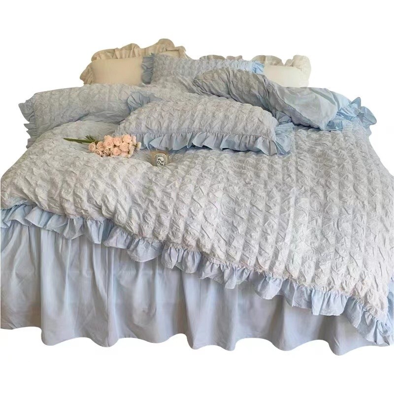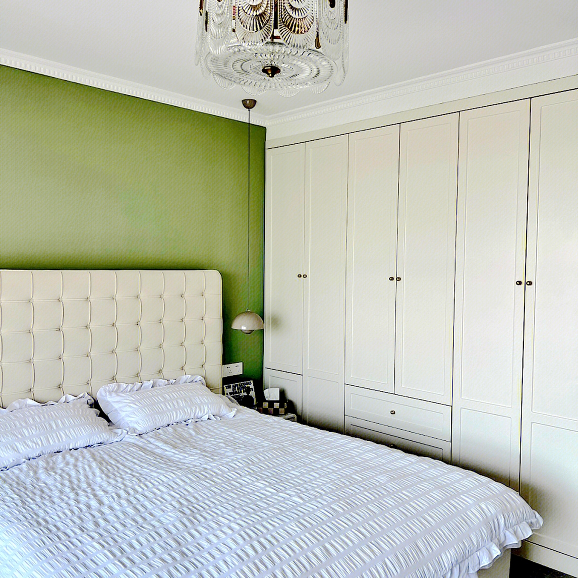 床是高靠背设计,放在卧室提升空间格调 ,床头皮质感摸起来也舒服,搭配泡泡纱四件套显得清新又温柔是夏天的颜色。