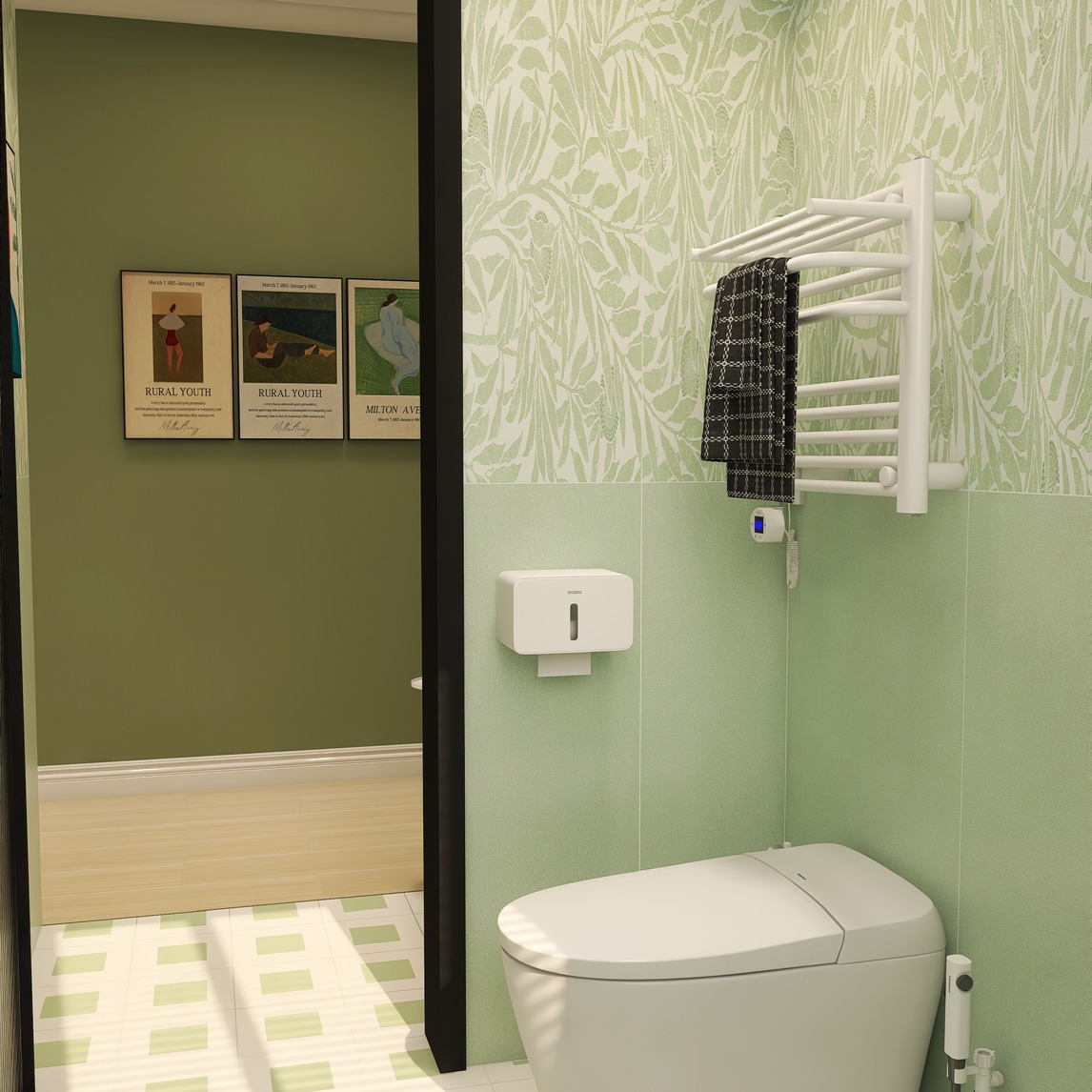 浅绿色的上墙搭配上绿色的下墙,和谐且减少沉重感。再配上木色的地板,增添几分家的温暖,冷调暖调配合相得益彰。