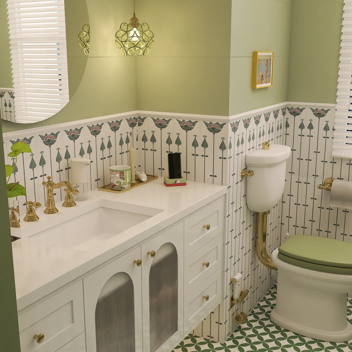 卫生间采用绿色为主色,搭配白色五金,毫无违和感,放在一起就是好看,还令人眼前一亮!搭配绿色的小壁灯,高级感十足!