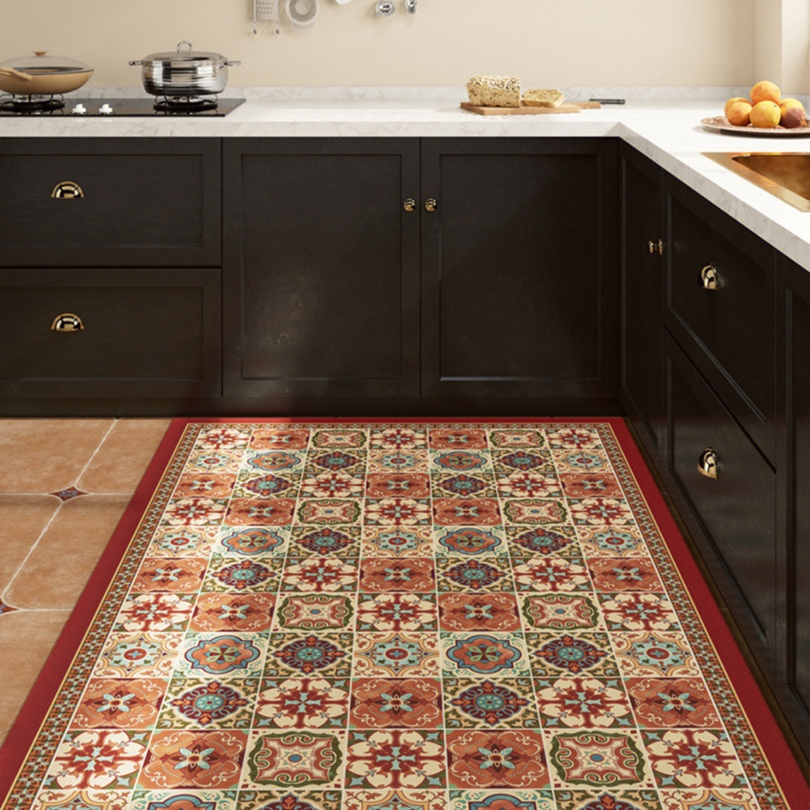 就是这块地垫彻底把我妈征服了,复古的小花砖真的很讨喜了,有种老洋房的复古韵味。 皮革材质防水防油还免洗呢,脏了直接一拖就搞定。而且它还有一定厚度,能减少碗筷掉落摔坏的风险。