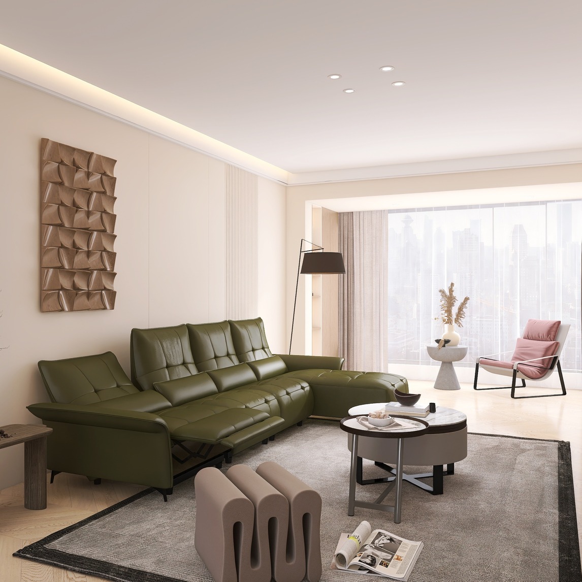 森系的自然与温柔的奶油风很好的融合在一起,阳光撒入整个客厅,慵懒温暖又治愈人心~~这张法式复古的橄榄绿沙发,采用优质头层牛皮面料,颜值与实力并存,让客厅里充满绿意。