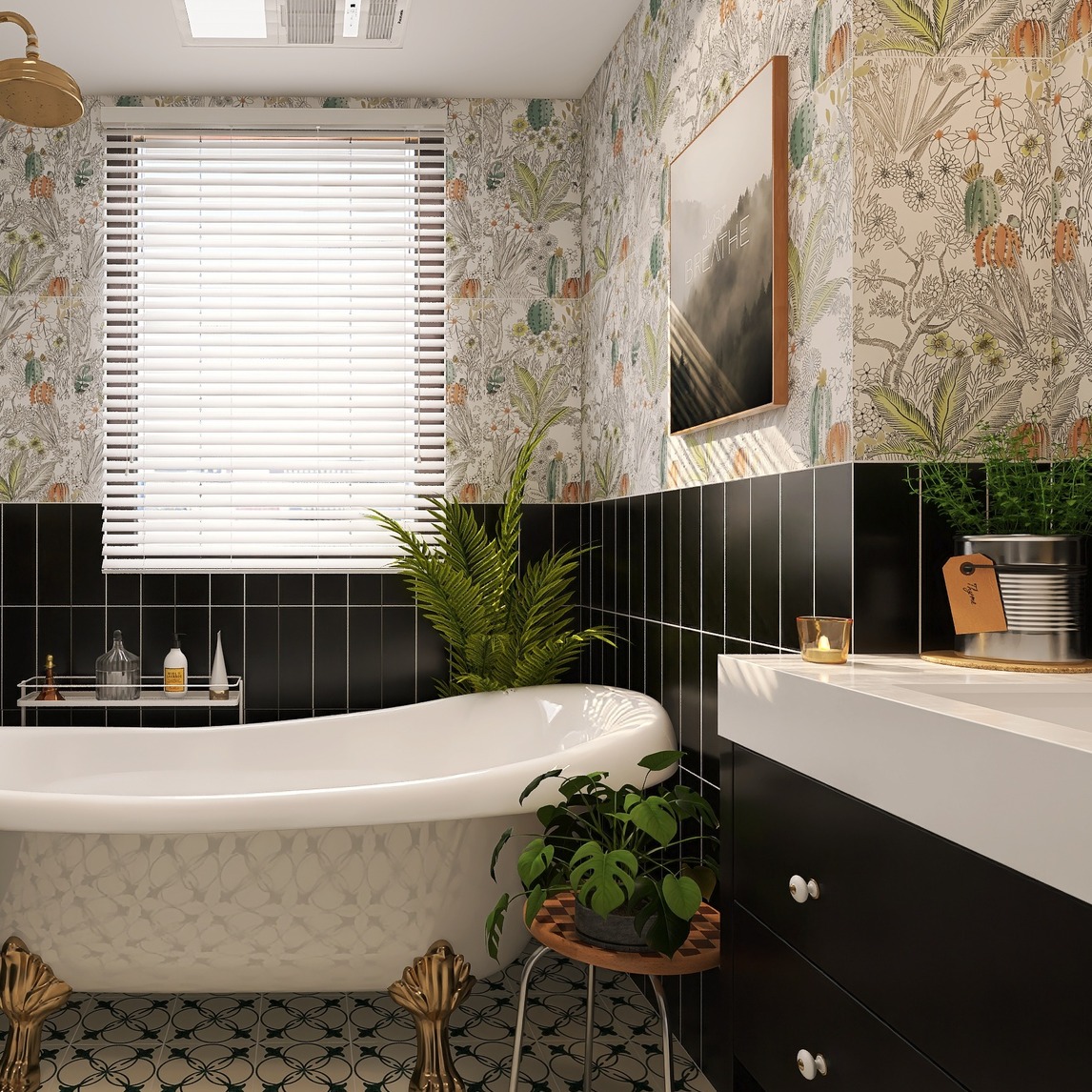 卫生间风格把控在复古风,搭配金色的五金,干墙面半墙设计,下半墙的黑色瓷砖,更让卫生间有种神秘感,打造一处与众不同的卫生间!