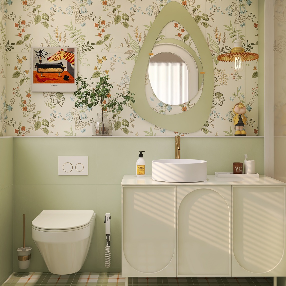 整个卫生间以牛油果绿为基调,辅助以轻法式花砖来点缀局部,凝练出一种高级感与一丝灵动。牛油果绿瓷砖打造的半墙,使整个卫生间呈现出一种暖调的内敛矜持又不失高雅的氛围感。卫生间的色调俏丽清新,一盆葱郁的盆栽...展开