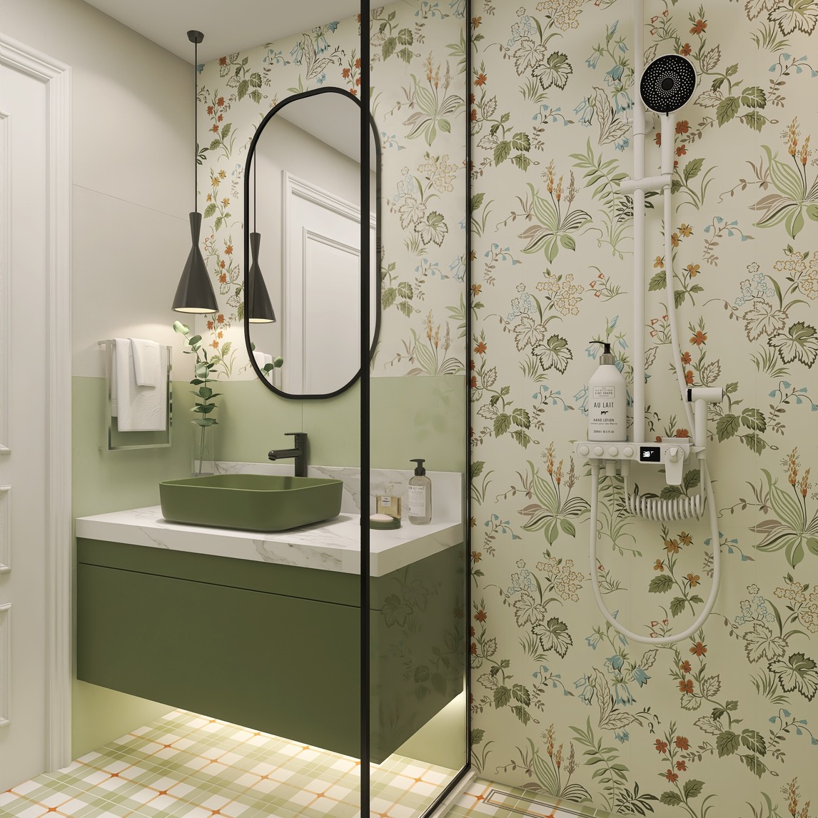 奶油奶油的微水泥材质,优雅气息瞬间扑面而来,配合着灯光的烘托,满满的氛围感。运用不同的瓷砖搭配使卫生间的层次感分明,瓷砖之间的变换,使卫生间多了几分趣味。绿色+白色的卫生间配色、线条简洁的悬空洗漱台,...展开
