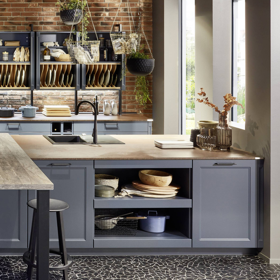 深度的蓝色选择磨砂视觉感门板,特殊色彩也是点亮空间的一个表现手法。铁蓝色的沉稳静谧更显质感。细节收纳的设计小空间,满足生活中的小习惯。质感深色木纹台面吧台符合整体质感的选择。