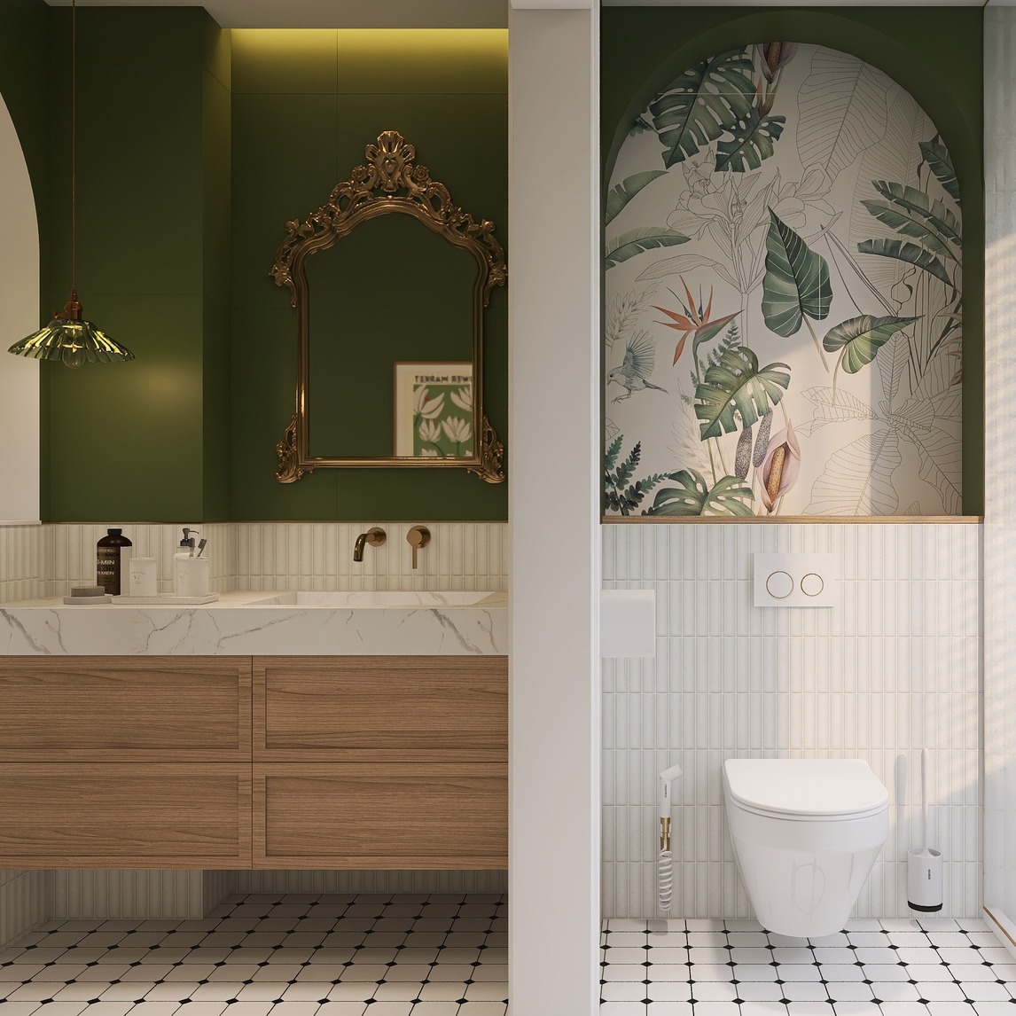 整个卫生间围绕绿色复古风去设计,原木色的洗手柜搭配复古绿色的瓷砖,白色马桶搭配绿色拱门,全心打造一个绿色复古气质卫生间!