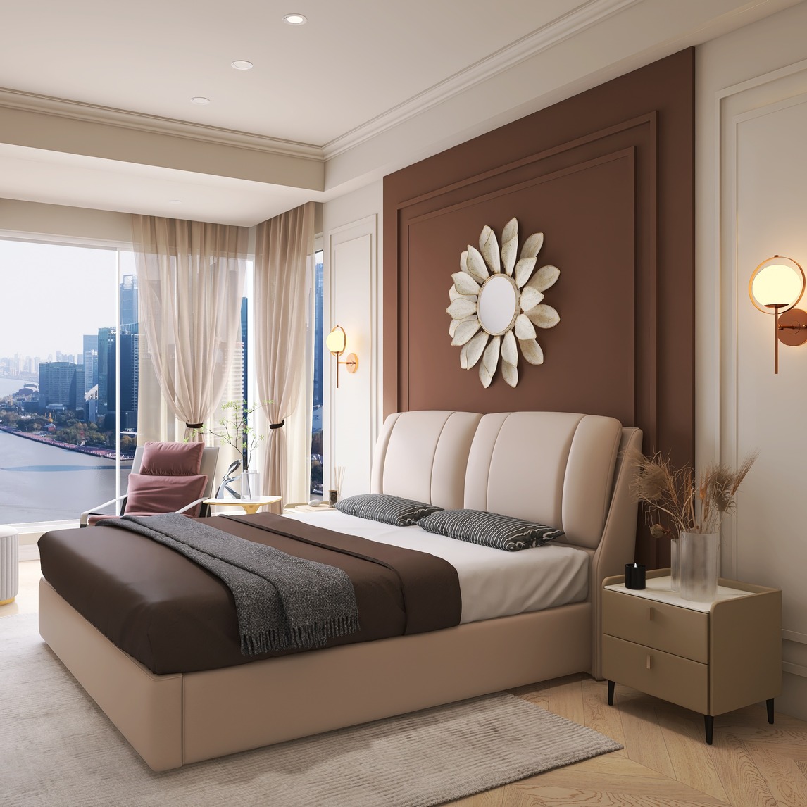 灰红色与奶油白的床头背景墙作为空间的亮点。清新温暖又复古。素雅经典且温暖的月光白皮床,给空间带来温馨舒适的氛围。温馨柔和的灯光点缀,卧室里弥漫着浓浓的优雅和浪漫气息。