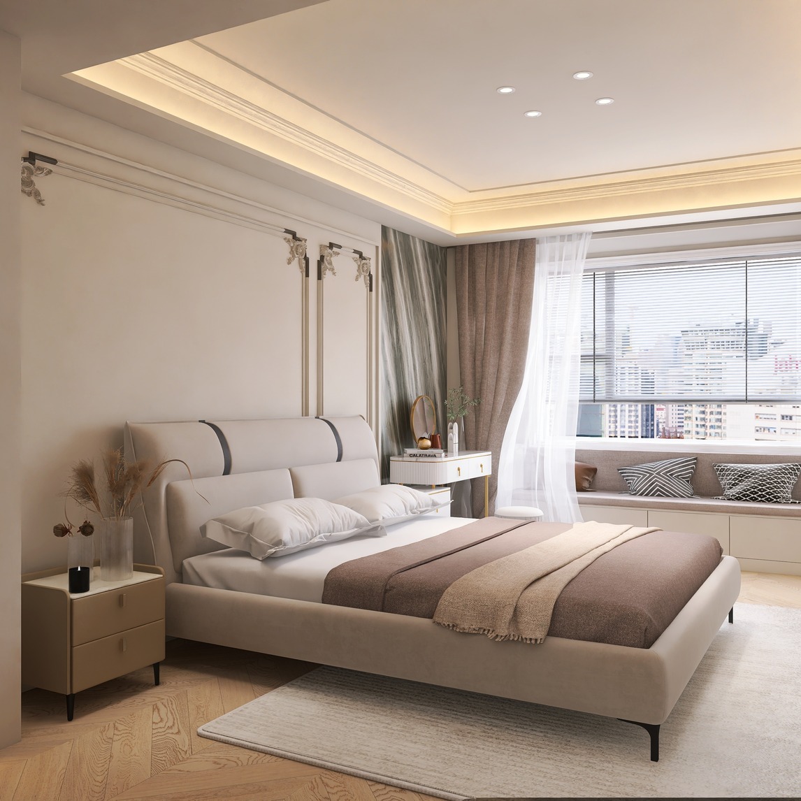 整体采用奶油色调,加入少量灰绿色大理石进行撞色设计,非常温柔舒适,同时点缀了一丝黄铜金属,增加复古的味道,简单纯粹且温柔的卧室。精致的米白色布艺床,舒适简约,复古与时尚相互交织。