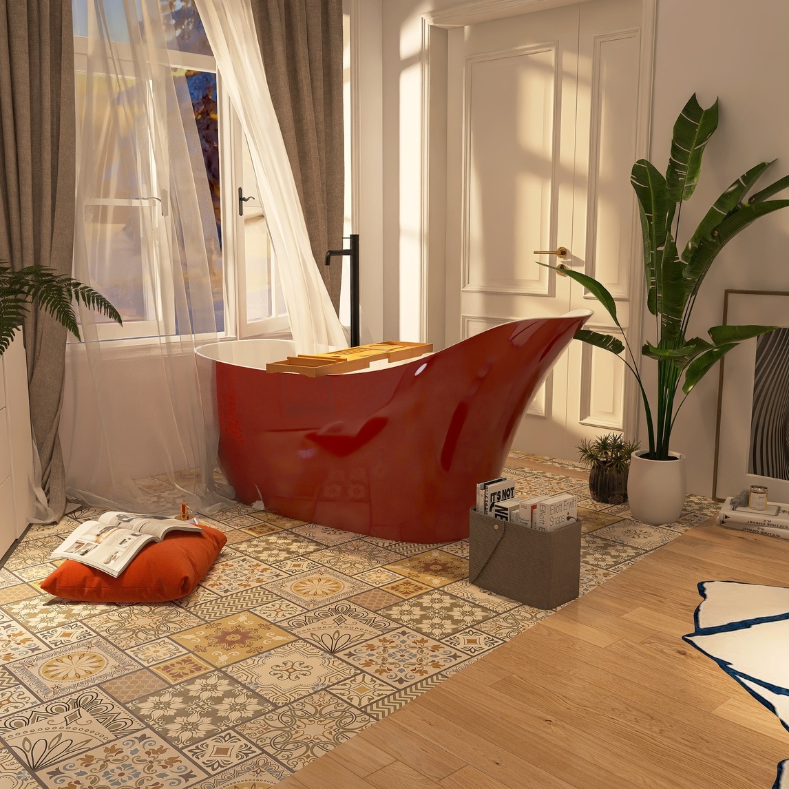 红白独立式高靠背浴缸搭配复古风格装修,窗外的光影打在墙面更添一份氛围。再选上几盆绿植,放空自己,一天的疲惫在此刻释放,一切都慢下来用温度和芳香,打造疗愈系的精致独处时间