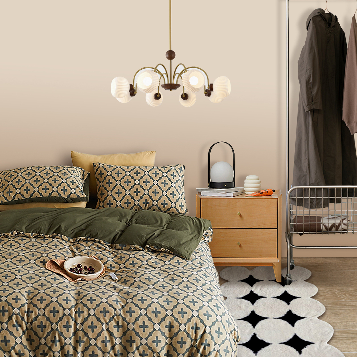 中古风真的是又温暖又慵懒,深色十字花纹的四件套,黑白菱形床边地毯,复古的花纹吊灯,快沉浸在复古的睡眠故乡中吧。