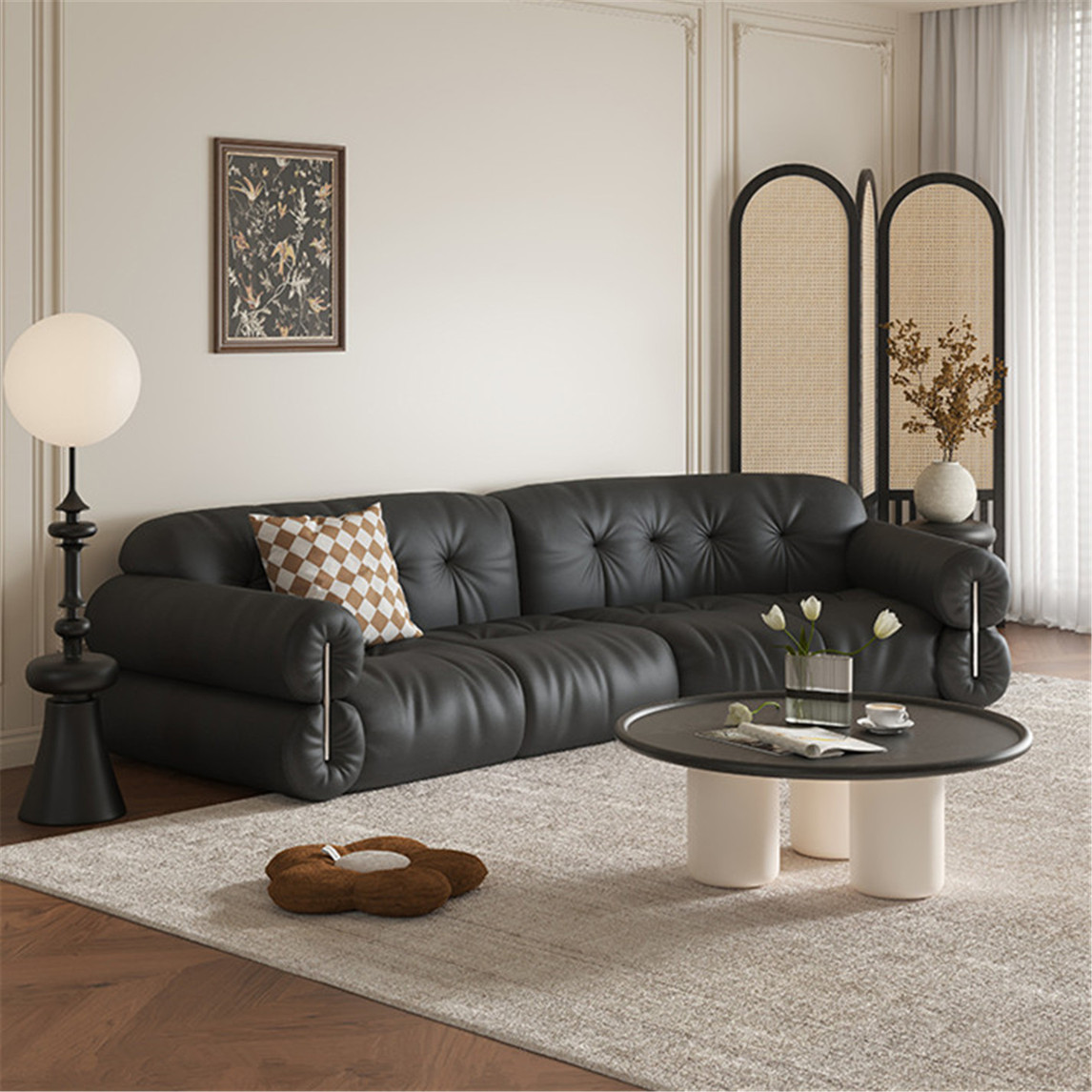 复古感十足的黑色牛皮,搭配时尚摩登造型,符合了大部分人对一款沙发的全部想象,宽厚扶手+大坐深+软硬适中的三层海绵,柔软有支撑,简直不要太舒服!