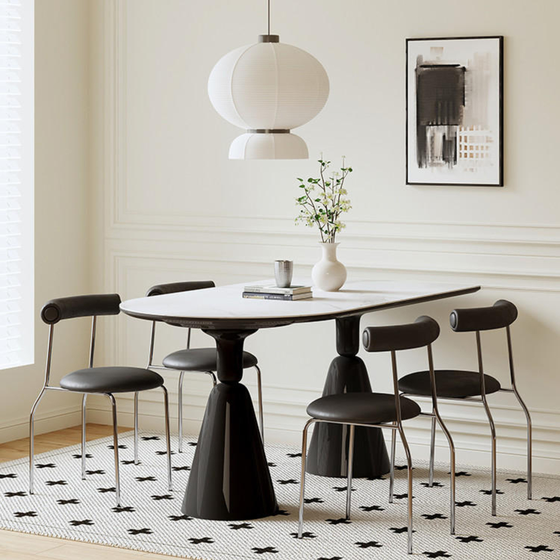 色彩对于餐厅空间氛围的烘托是起着非常重要的作用的,从地毯到餐桌到墙面到吊灯,整个空间的每一处每一件都服务于整体,低调奢华,静谧优雅,这就是法式奶油风的奥义。