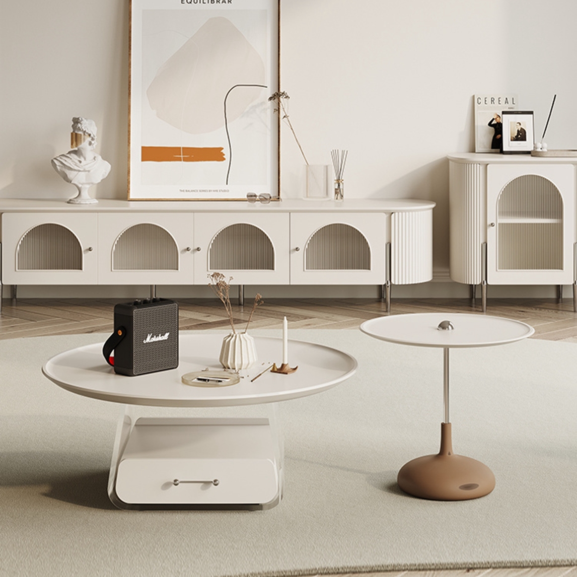 小户型来一张直径90公分的圆形茶几,再搭配一张可移动的50公分小边几。占地不大。但内含乾坤,满足小家的大收纳要求。