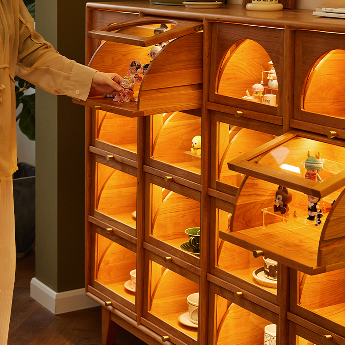 这个展示柜总体来说还是好看的,特别是打开灯的时候。充满艺术气息,颜值担当 怎么拍都好看,家里立刻感觉很温暖。
