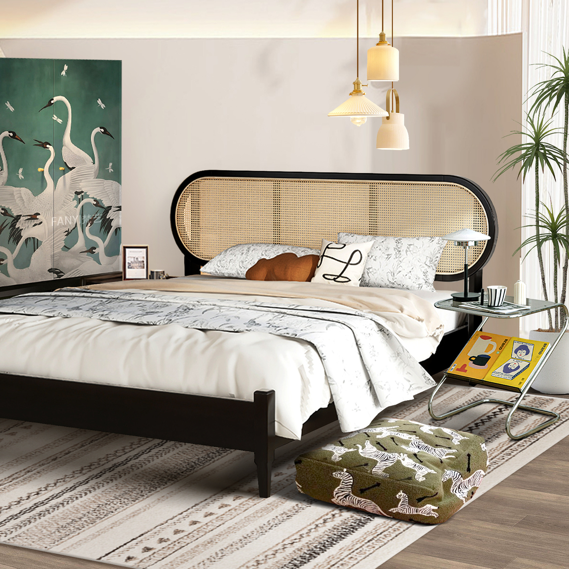 中古风卧室,虽然房间小了一点,但是还是有一些艺术气息,阳光照进来足够温暖舒适,浅色的线条地毯与天鹅的储物柜相对称。